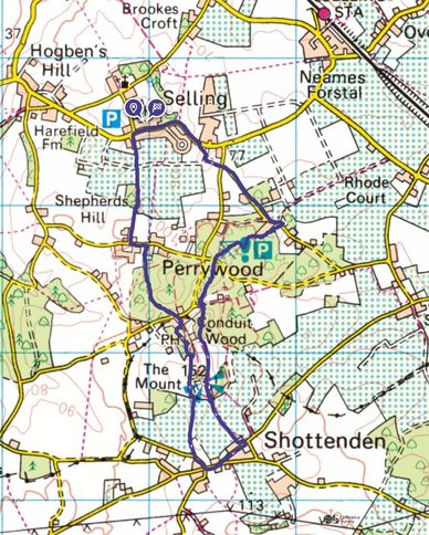 Showing walk with best bluebell glades starting at either The George in Molash or the car park for Kings Wood on White Hill, Challock